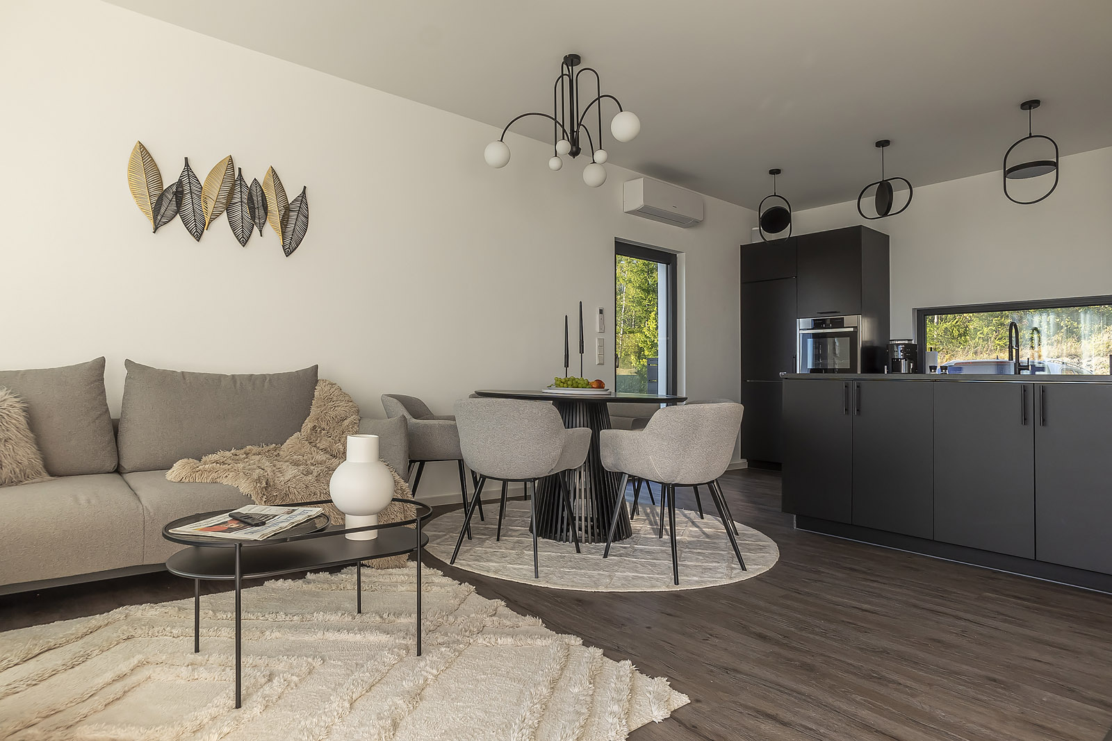 Die mittlere Etage bietet ausreichend Gelegenheit für gemeinsame Aktivitäten mit der Familie. Hier kann man in der offenen Küche zusammen kochen, im Wohnbereich entspannt fernsehen oder auch bei einem gemeinsamen Spieleabend auf einer der 2 Terrassen den traumhaften Sonnenuntergang genießen.