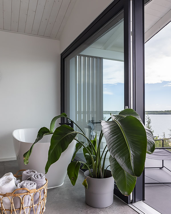 Das Highlight des Hauses befindet sich aber in der oberen Etage. Diese beherbergt den großzügigen Wellnessbereich mit großer Sauna, freistehender Badewanne und einen einzigartigen Blick auf den See.