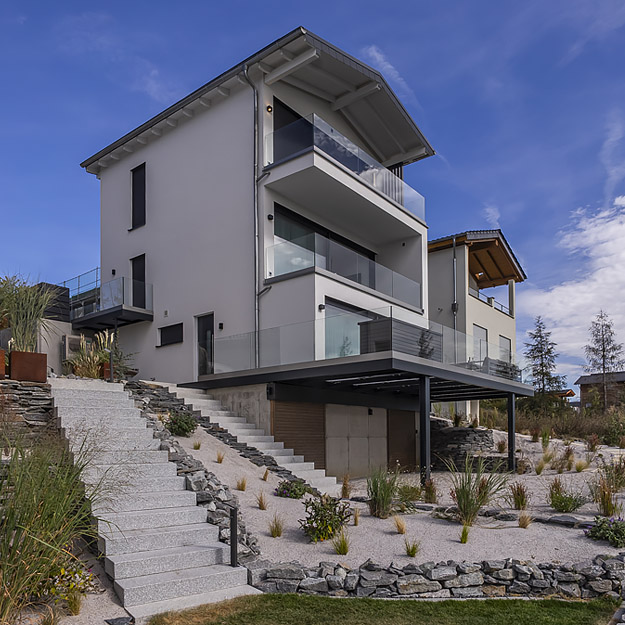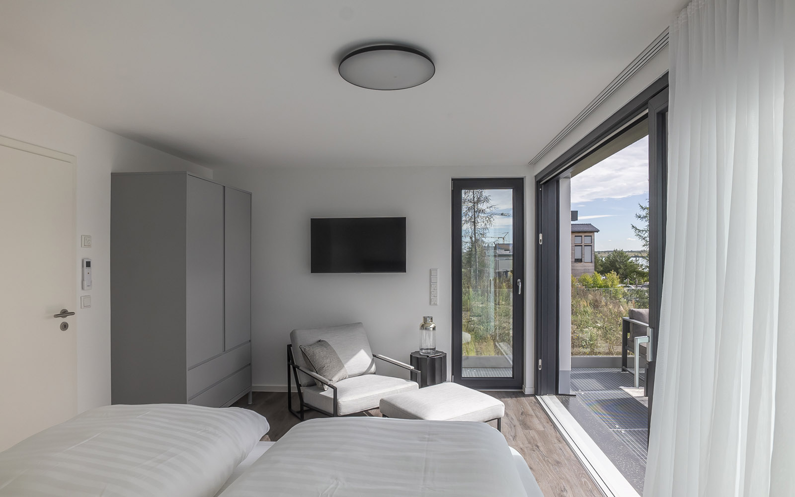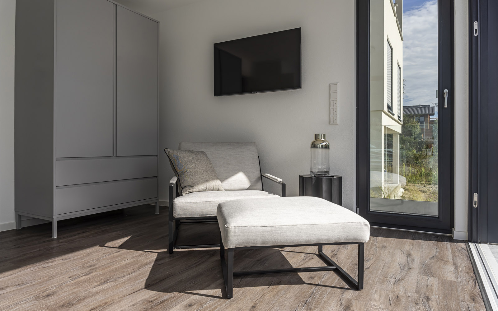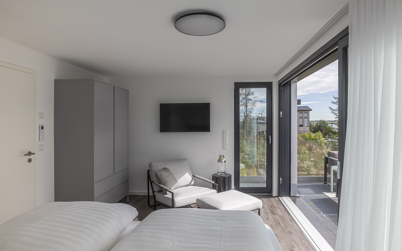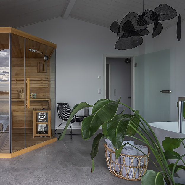 Das Highlight des Hauses befindet sich aber in der oberen Etage. Diese beherbergt den großzügigen Wellnessbereich mit großer Sauna, freistehender Badewanne und einen einzigartigen Blick auf den See.