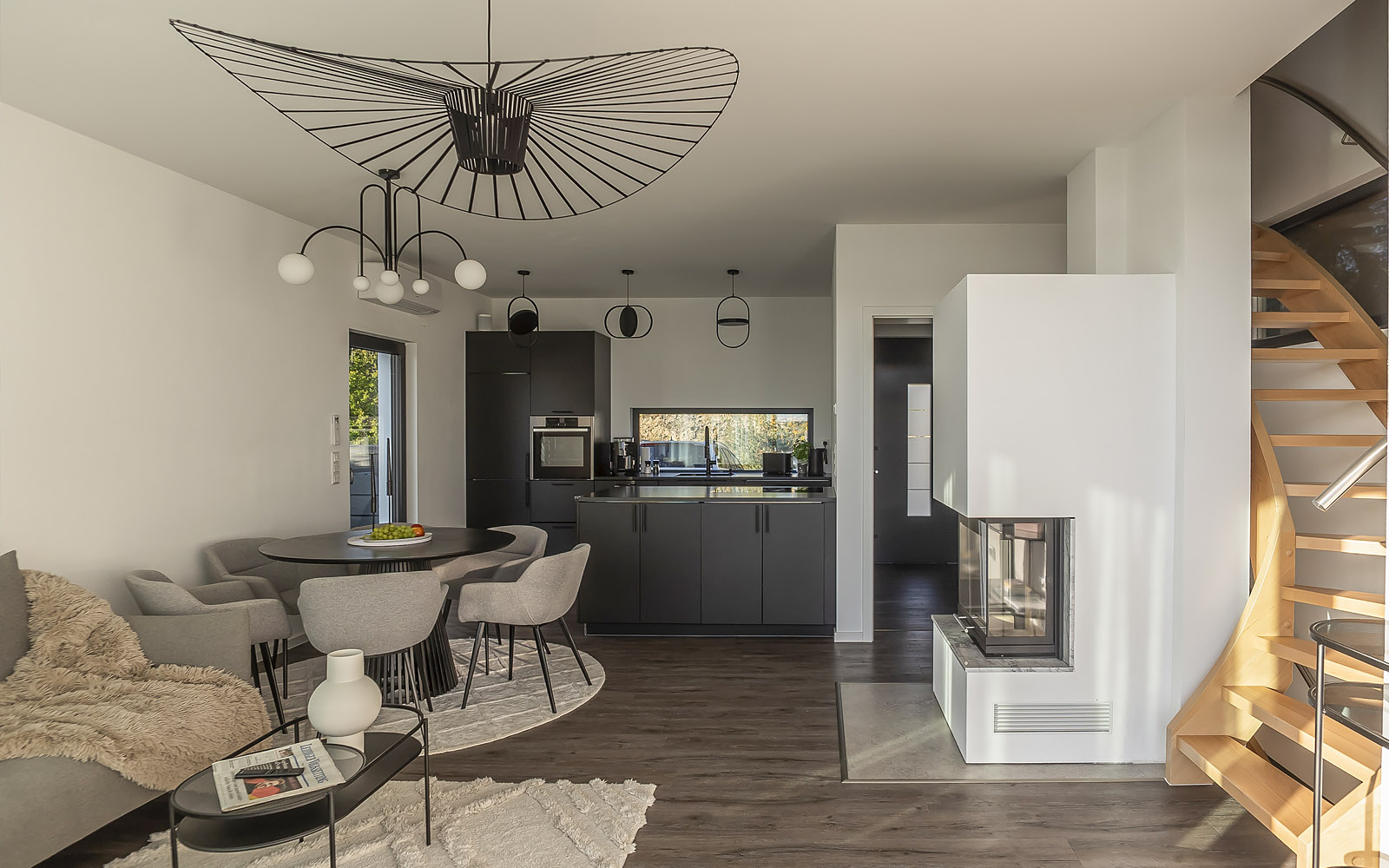 Die mittlere Etage bietet ausreichend Gelegenheit für gemeinsame Aktivitäten mit der Familie. Hier kann man in der offenen Küche zusammen kochen, im Wohnbereich entspannt fernsehen oder auch bei einem gemeinsamen Spieleabend auf einer der 2 Terrassen den traumhaften Sonnenuntergang genießen.