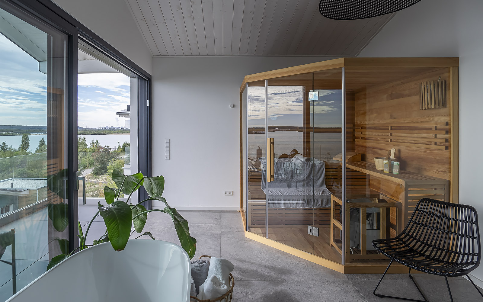 Entdecken Sie das ultimative Wellnesserlebnis mit unverwechslebarem Seeblick. Die geräumige Sauna lädt zu erholsamen Stunden ein. Tanken Sie neue Energie für Körper und Geist. Lassen Sie sich von der Sonne wärmen, während Sie in der Badewanne entspannen, und genießen Sie dabei die unvergleichliche Aussicht auf den Hainer See.